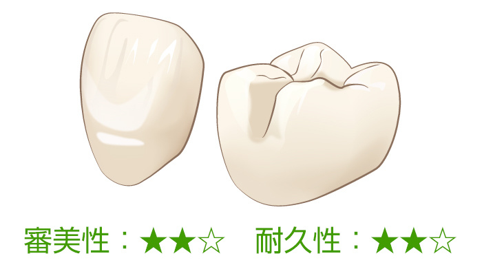 プラスチックとセラミックを混ぜ合わせた、やわらかく、周囲の歯を傷めにくい材質です。時間の経過によりツヤの減少や多少の変色があり、オールセラミックよりやや見た目が劣ります。