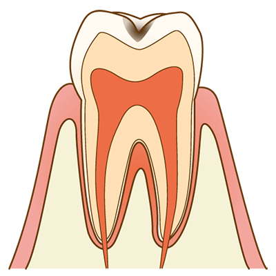歯の表面はエナメル質で覆われており、虫歯はまずエナメル質に発生します。エナメル質が虫歯になると、光沢がなくなり白っぽくザラザラした感じになります。虫歯は上の歯と下の歯の噛み合せの部分や、歯と歯の間などに発生しやすく、この段階ではまだほとんど痛みはありません。
