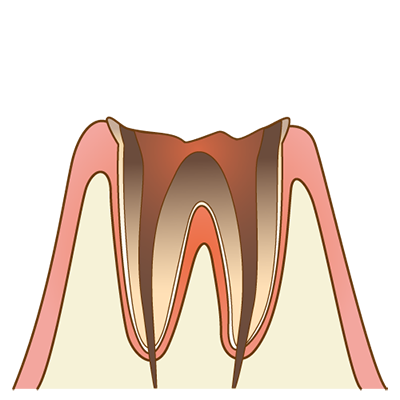 象牙質の内側には、神経や血管が密集した歯髄があり、虫歯がさらに進行して歯の神経まで虫歯菌に感染してしまうと歯髄炎となり、歯がひどく痛みだします。こうなると、虫歯になった部分の歯を削るだけでなく、歯髄まで取らなくてはなりません。治療が終わるまで時間がかかるうえ、歯髄を取ると歯がもろくなってしまいます。
