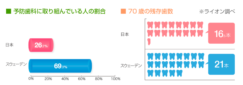 実際に国全体の歯科医療の方針として「予防歯科」の考えを導入しているスウェーデンは、歯科疾患が世界で一番少なく、むし歯や歯周病を予防することができているため、80歳を迎えてもほとんどの方が若い頃とほとんど変わらない本数の歯の維持ができています。幼い頃から生活スタイルとして歯の健診、歯の健康づくりが根付いていることが大きく影響していると考えられていて、近年、日本にもその習慣が少しずつ浸透してきています。