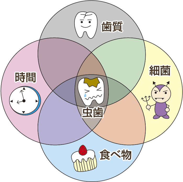 虫歯は歯質・細菌・食べ物の3つの要素に時間の経過が加わってできると言われています。