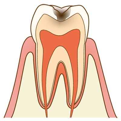 歯の表面はエナメル質で覆われており、虫歯はまずエナメル質に発生します。エナメル質が虫歯になると、光沢がなくなり白っぽくザラザラした感じになります。虫歯は上の歯と下の歯の噛み合せの部分や、歯と歯の間などに発生しやすく、この段階ではまだほとんど痛みはありません。